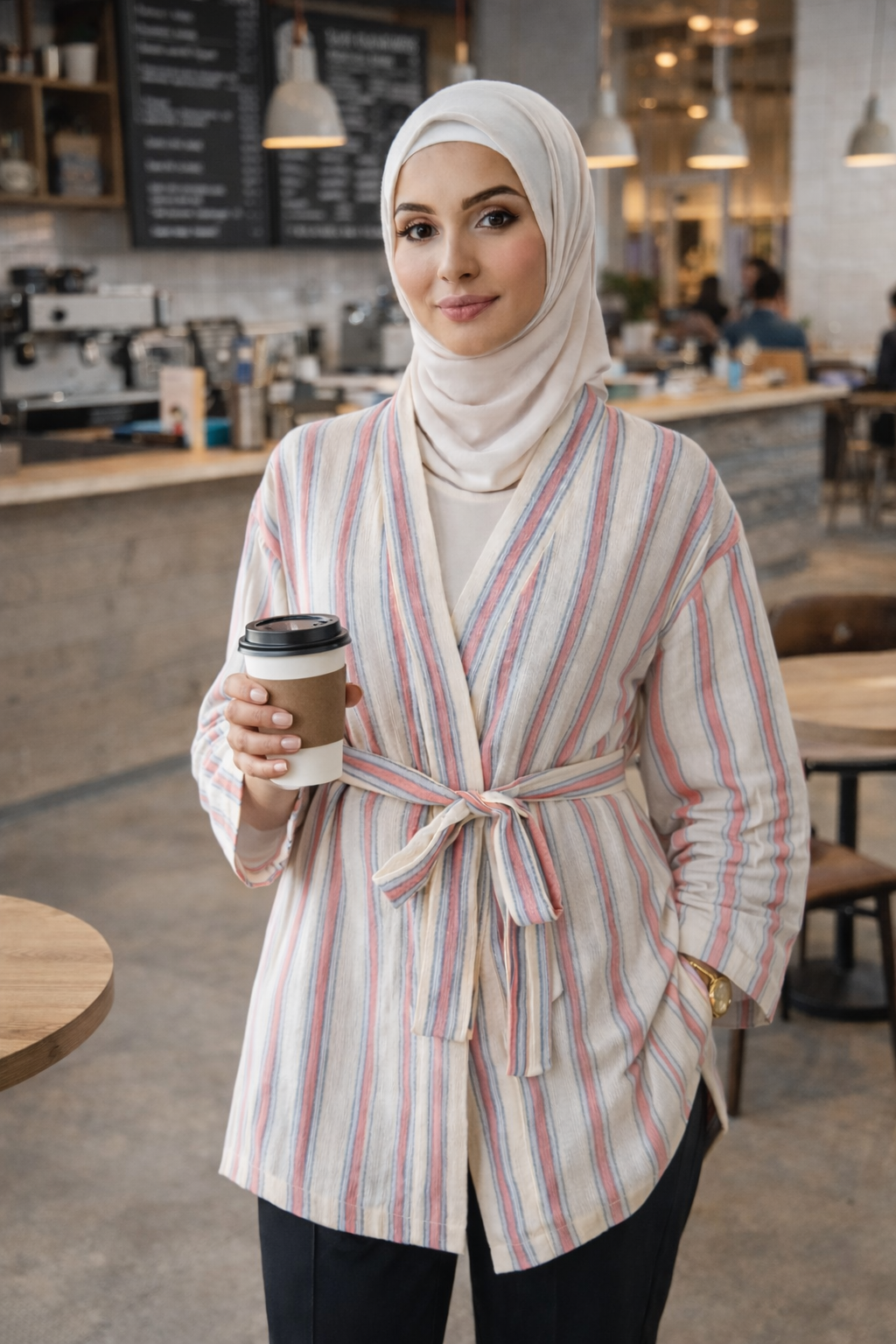 This hand-woven kimono in pink and blue , with its tie-waist design, conforms to the body shape and creates an elegant silhouette. Combining ethnic touches with modern lines, the Mirach Textile kimono stands out as a complementary outerwear piece in dress, tunic, trouser, and skirt combinations. Thanks to its timeless design, it is a strong modest kimono jacket alternative that can be preferred in every season.