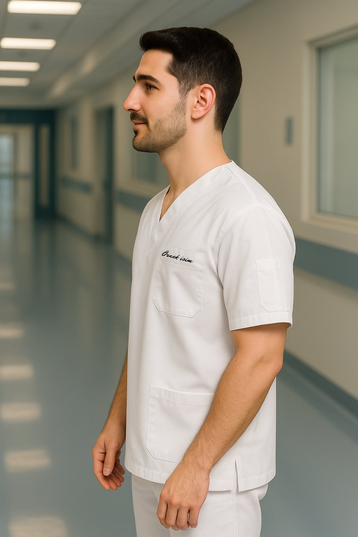 Kişiye Özel İsimli Erkek Tek Üst 4 Cepli Scrubs Forma - Beyaz