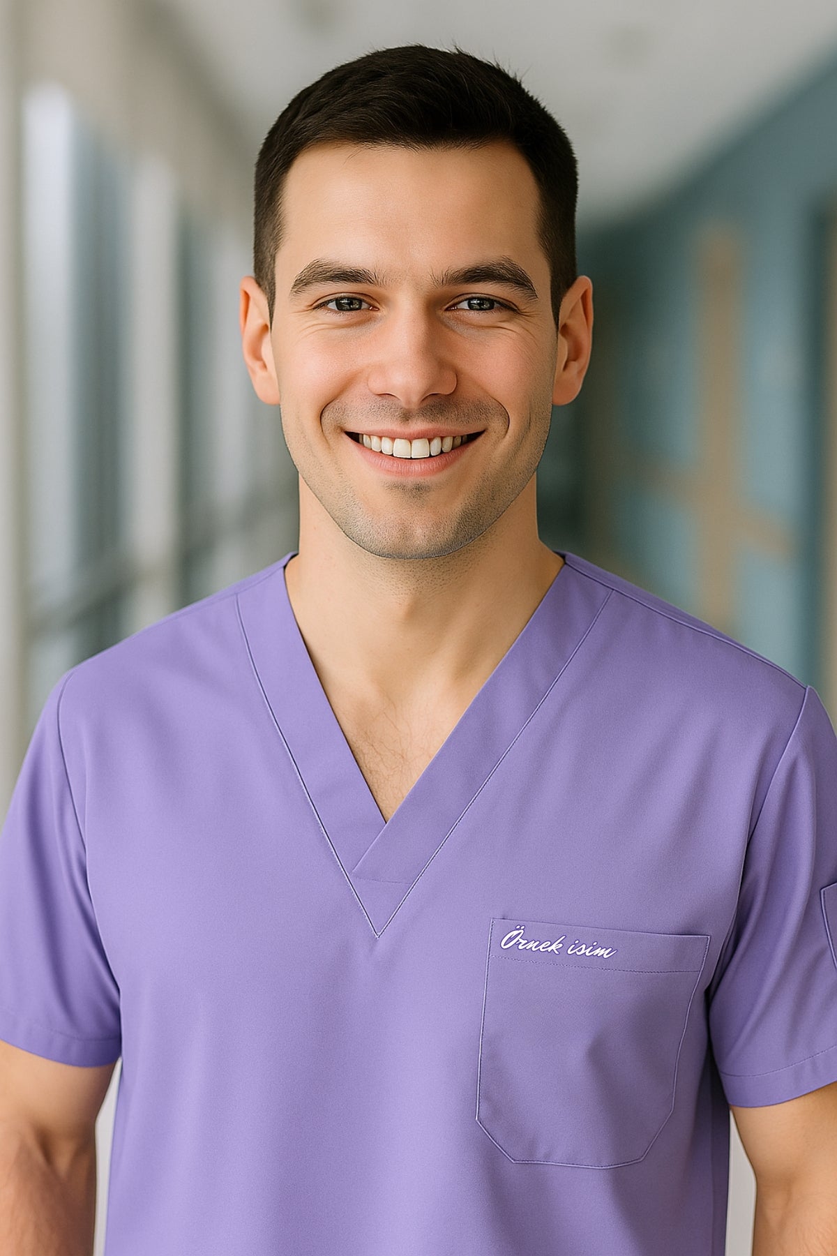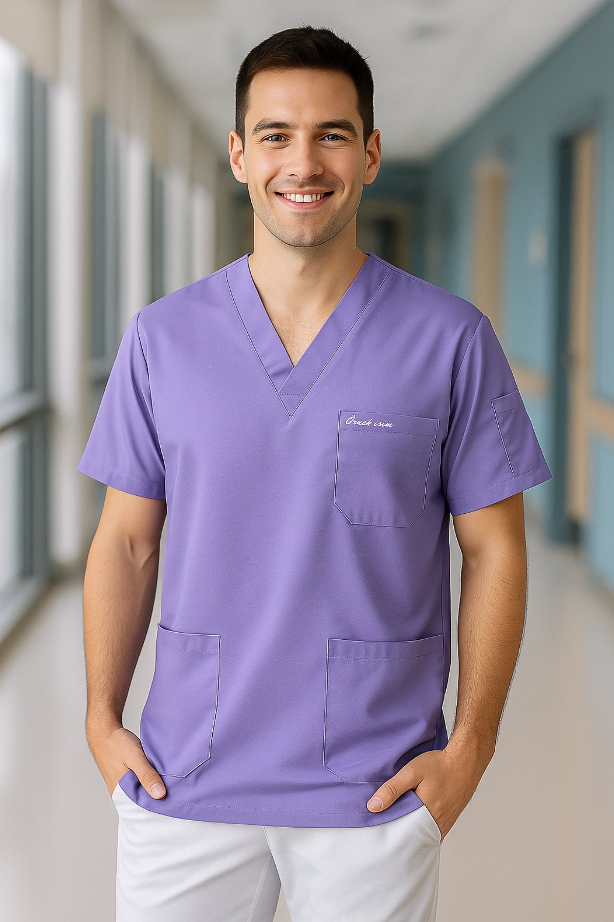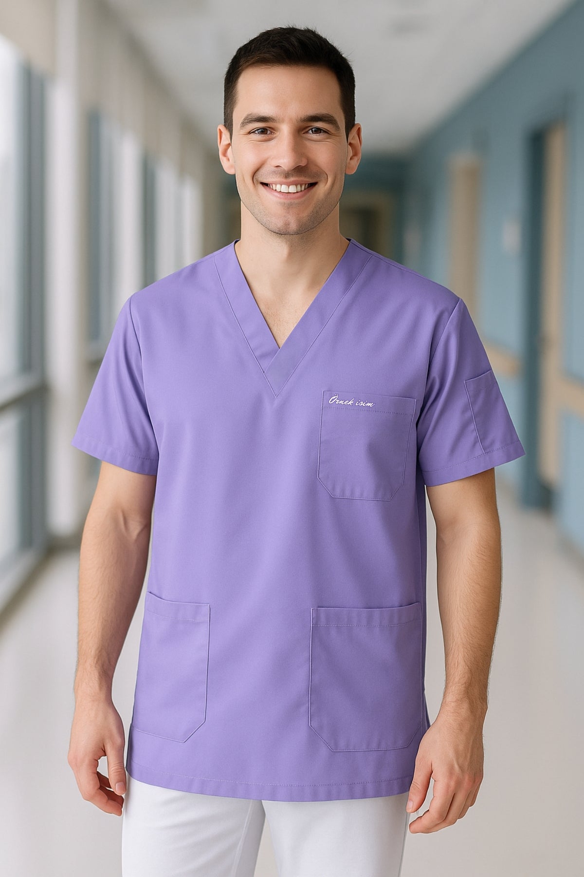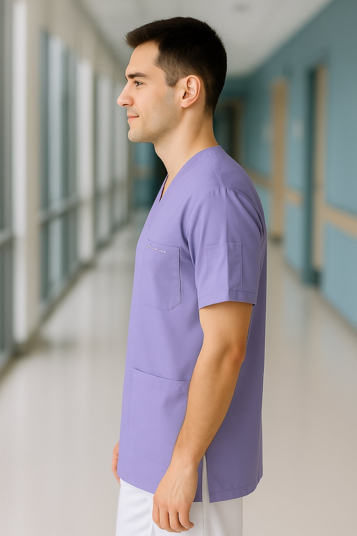 Kişiye Özel İsimli Erkek Tek Üst 4 Cepli Scrubs Forma - Lila