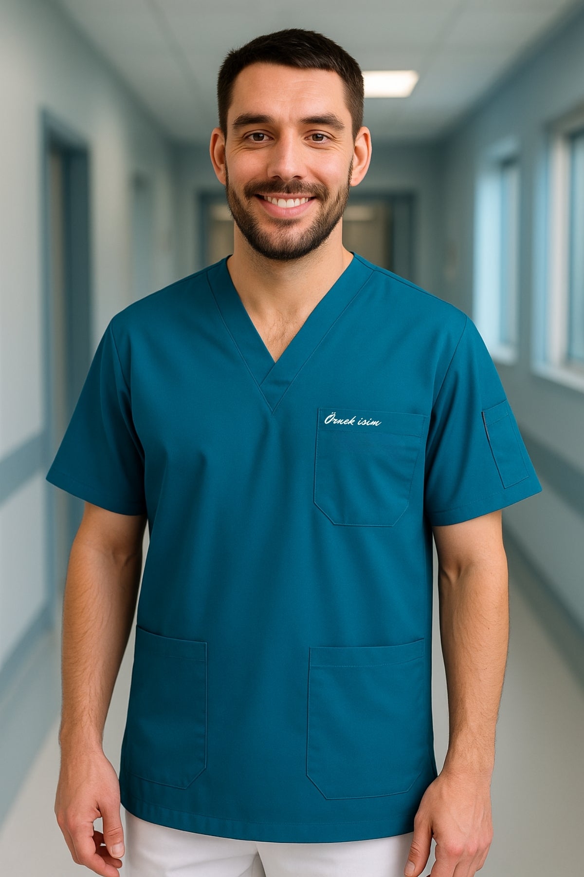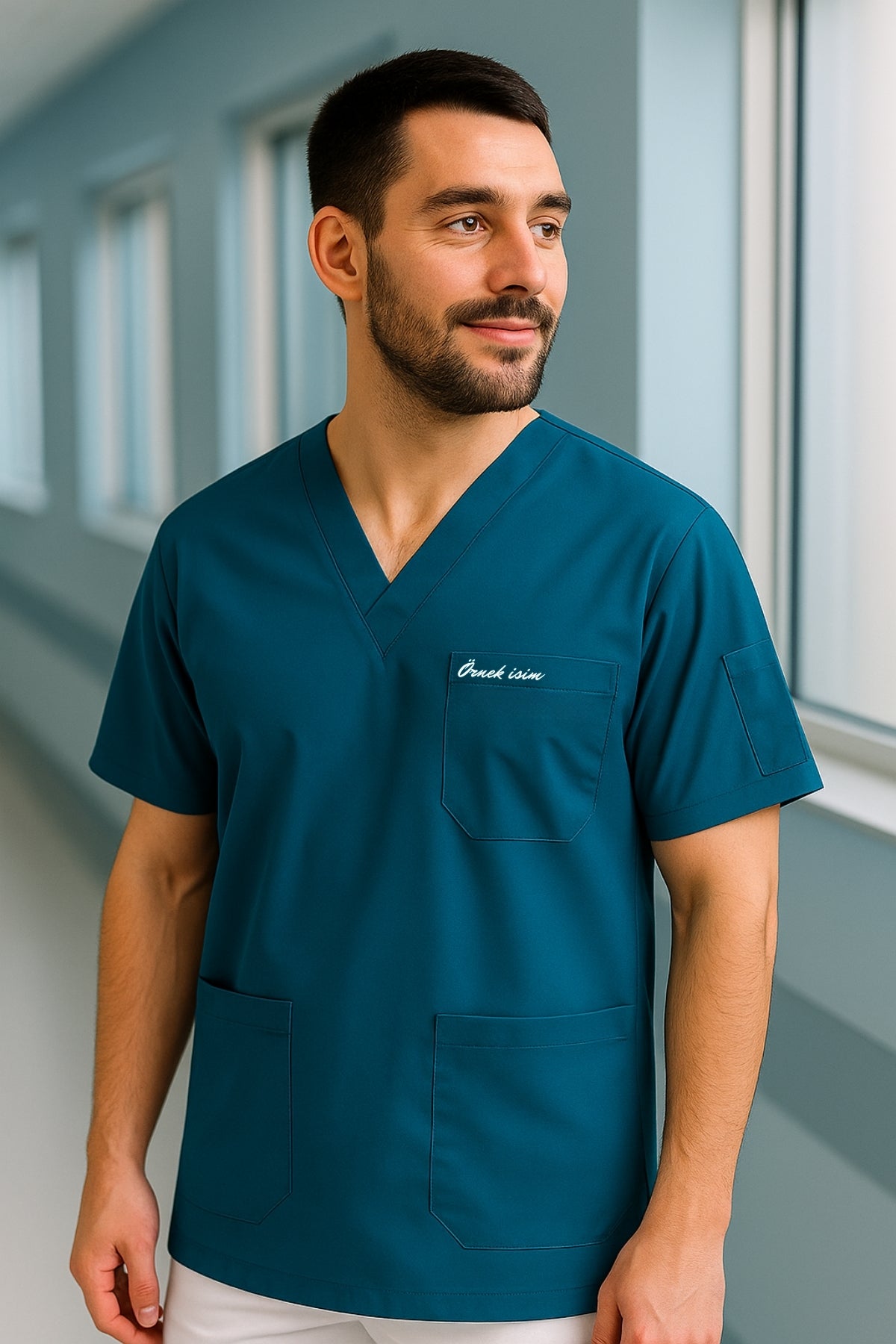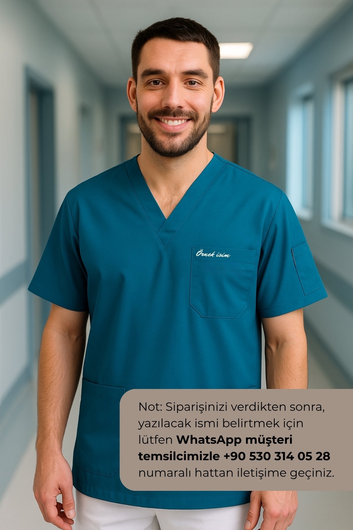 Kişiye Özel İsimli Erkek Tek Üst 4 Cepli Scrubs Forma - Petrol