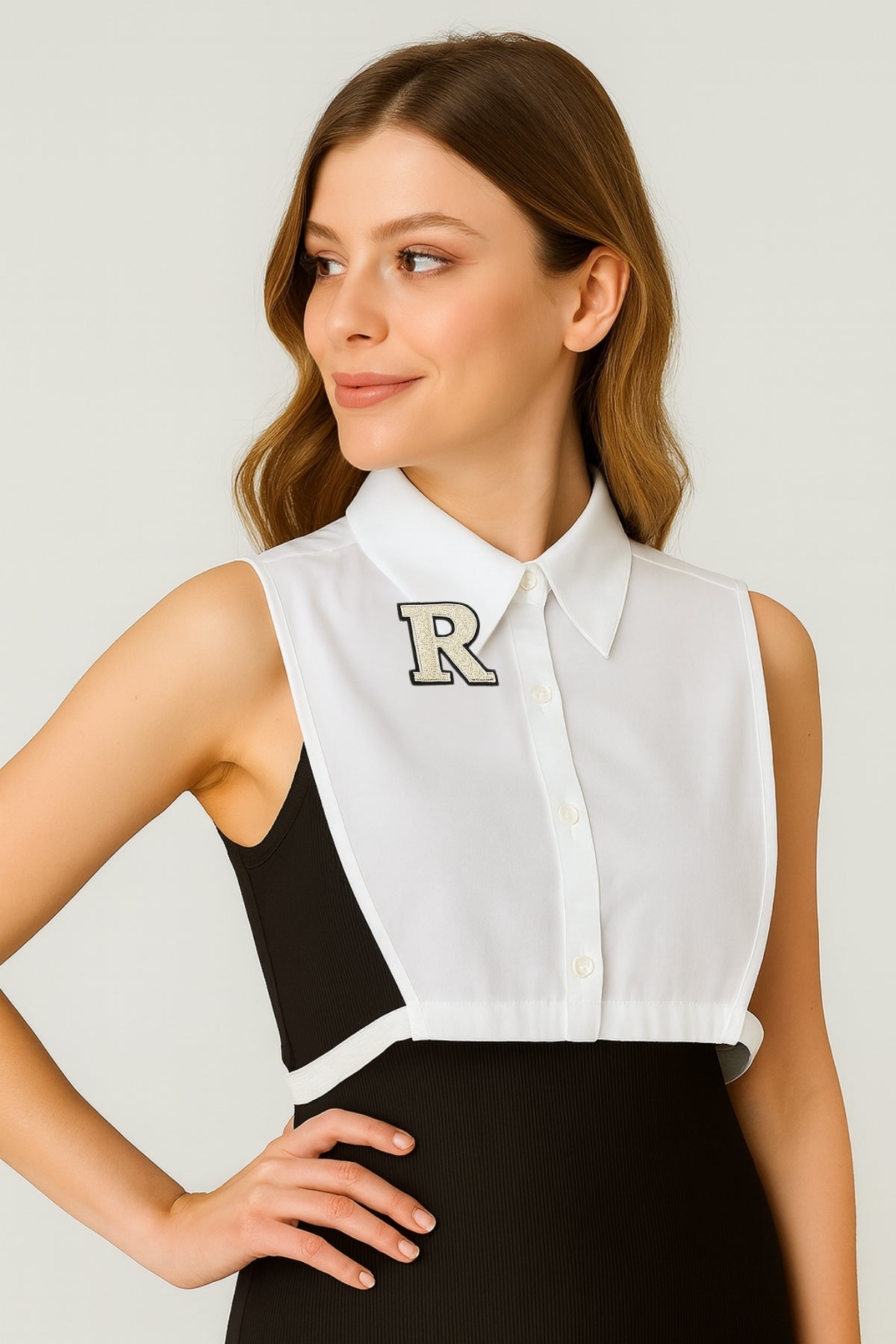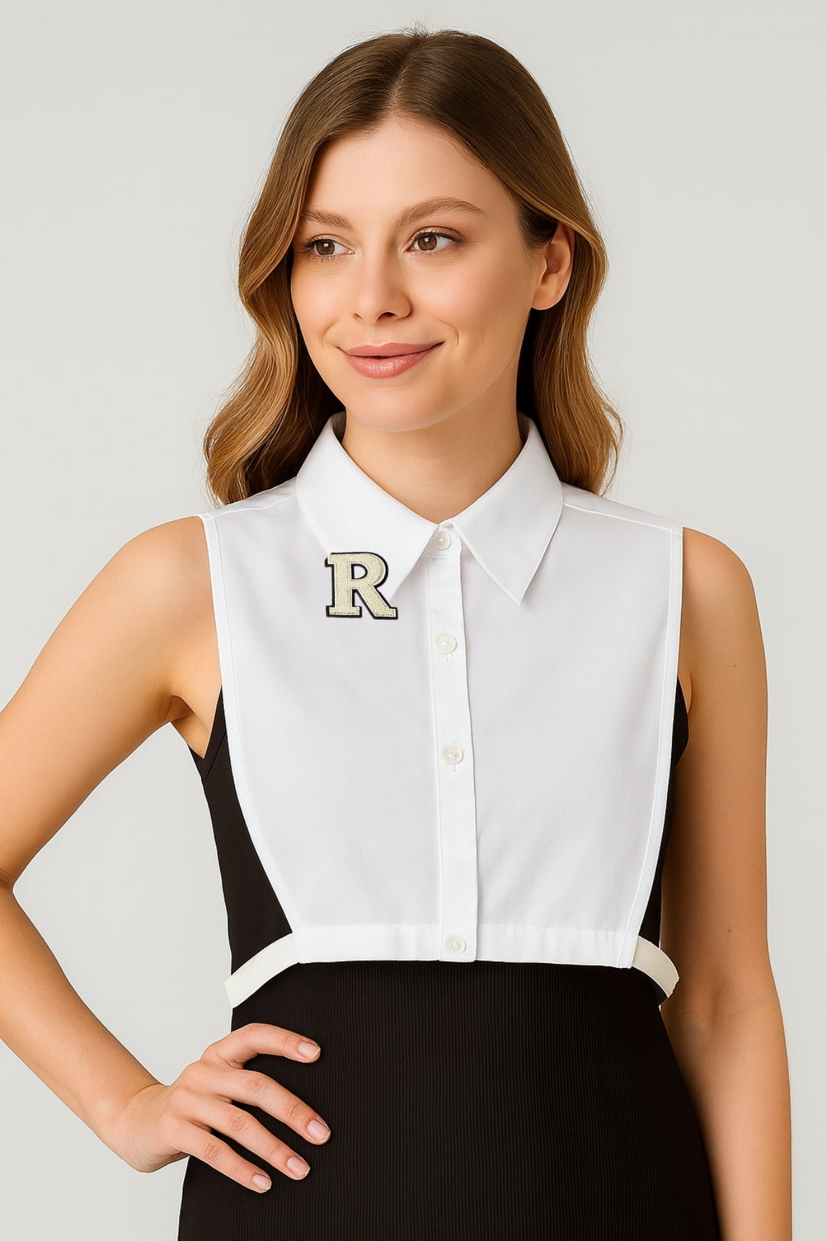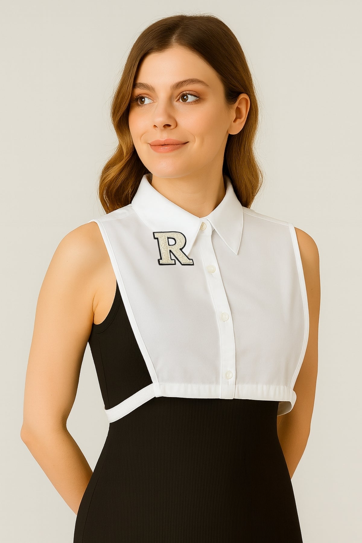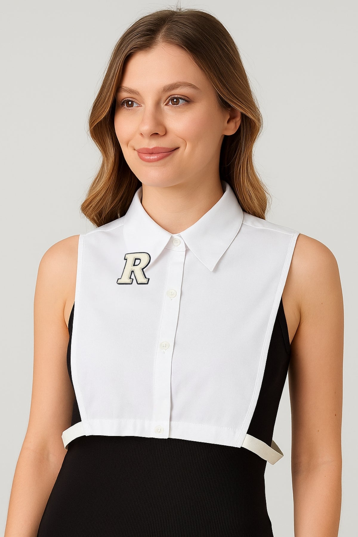 Mirach Textile's letter-detailed white shirt collar , featuring the letter R, offers a personal touch. Its elegant design highlights your elegance for both everyday wear and special occasions. Its lightweight construction and relaxed cut make it a comfortable complement.