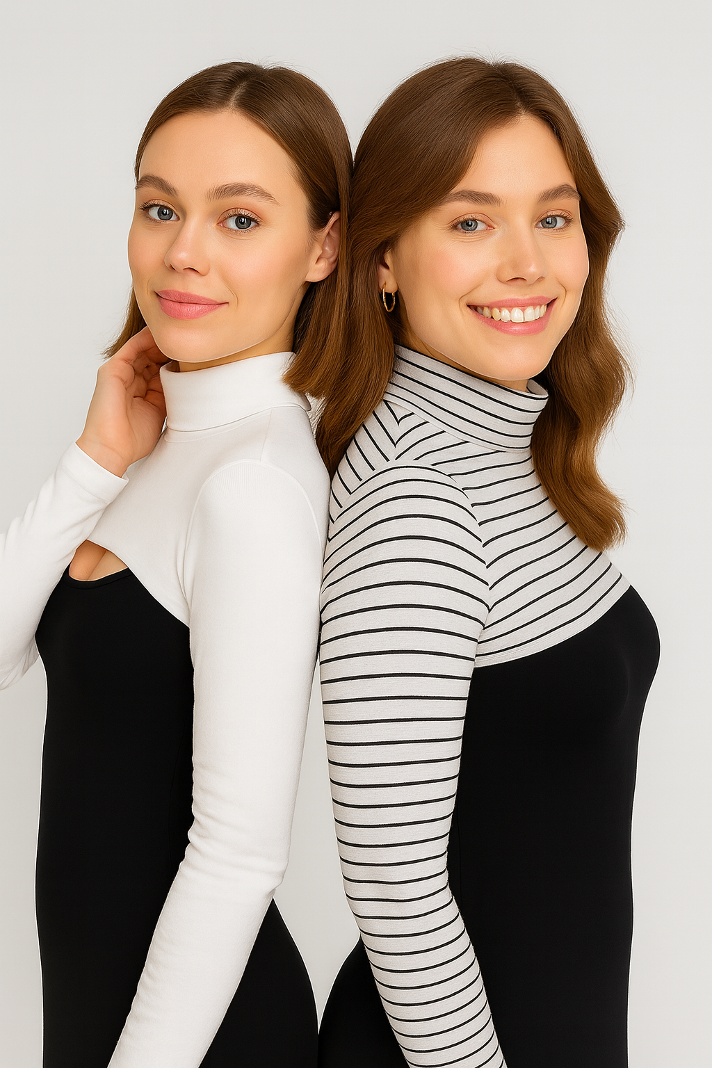2’li Paket Dik Yaka Boyunluklu Kolluk Seti – Çizgili & Beyaz, gardırobunuzda “her an lazım olan” temel parçaları bir arada sunuyor. Bir pakette iki renk olması, hem stil özgürlüğü hem de ekonomik avantaj sağlıyor.