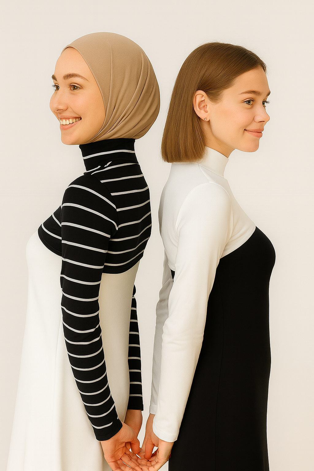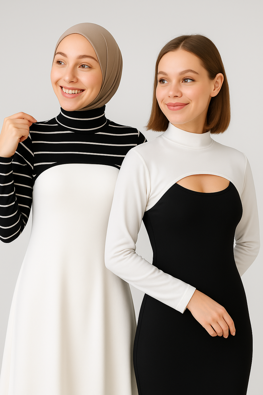 Dik yaka tasarımı sayesinde boyun kısmını zarifçe kapatır ve açık yakalı üstlerde ekstra içlik ihtiyacını ortadan kaldırır. Boyunluk ve kolluk entegre formda olduğu için tek parça ile pratik kullanım sunar — kayma, toplama veya ekstra iç parça arama derdi yok!