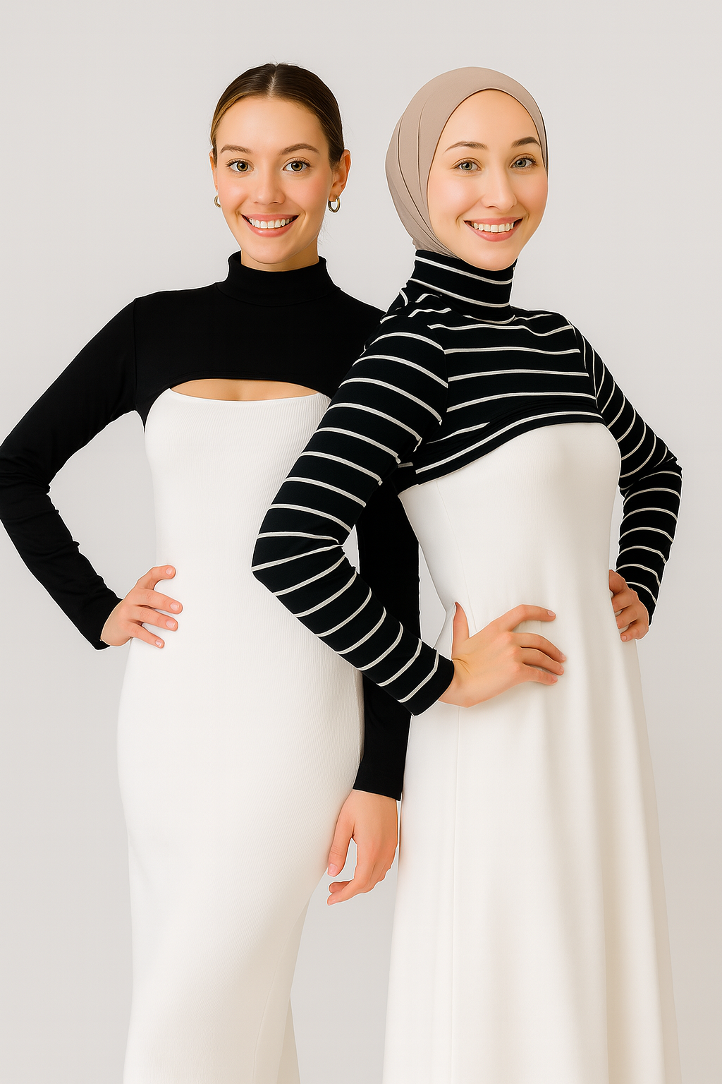 Dik yaka tasarımı sayesinde boyun kısmını zarifçe kapatır ve açık yakalı üstlerde ekstra içlik ihtiyacını ortadan kaldırır. Boyunluk ve kolluk entegre formda olduğu için tek parça ile pratik kullanım sunar — kayma, toplama veya ekstra iç parça arama derdi yok!