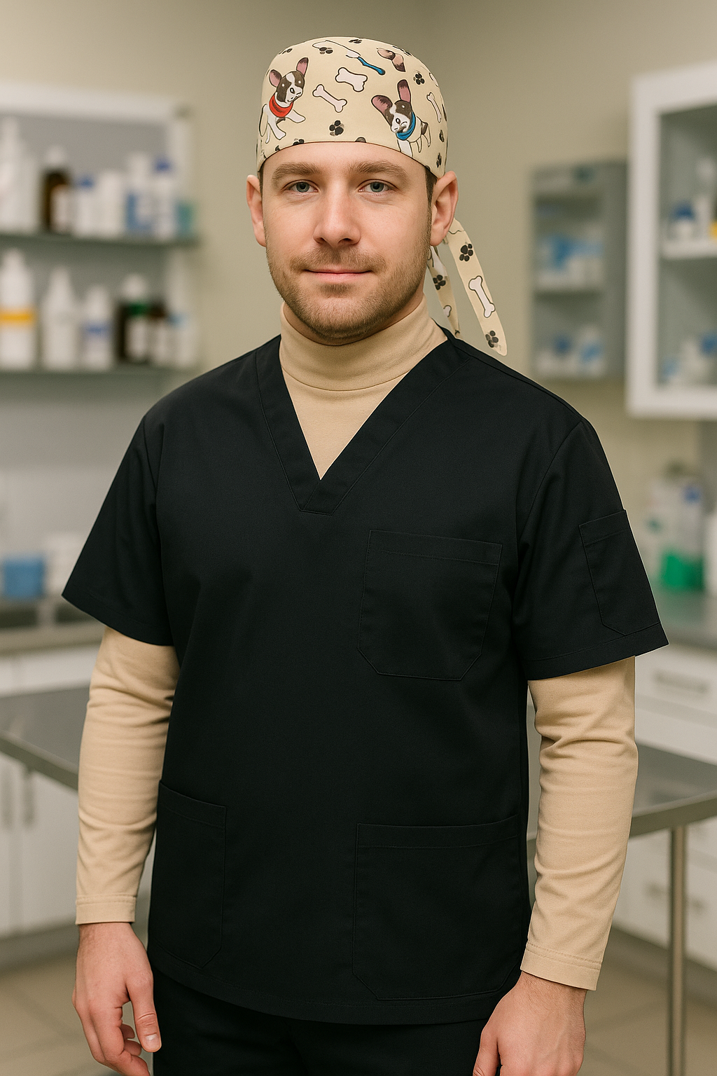 - Set İçeriği: 1 adet siyah scrubs üst, 1 adet can dostum cerrahi bone, 1 adet boyunluklu kolluk