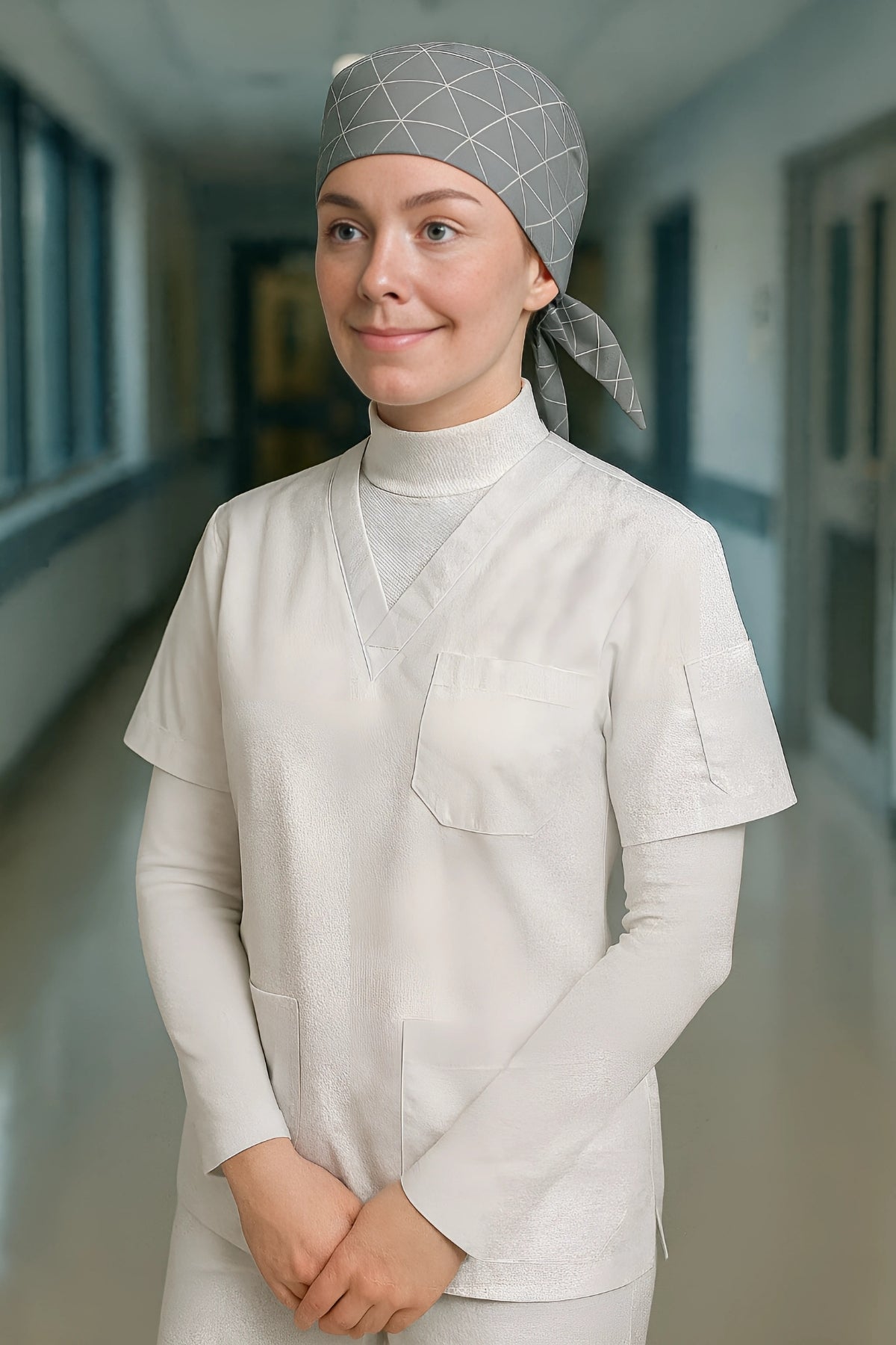- Set İçeriği: 1 adet beyaz scrubs üst, 1 adet modern çizgiler cerrahi bone, 1 adet boyunluklu kolluk