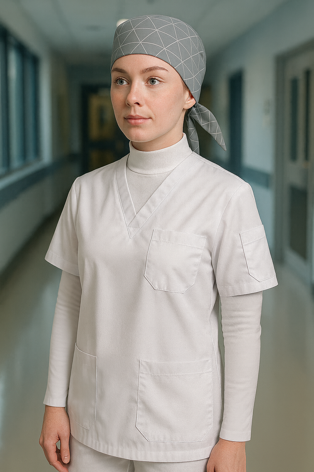 - 1 adet Beyaz Scrubs Üst (V yaka, rahat kalıp, 4 cepli)