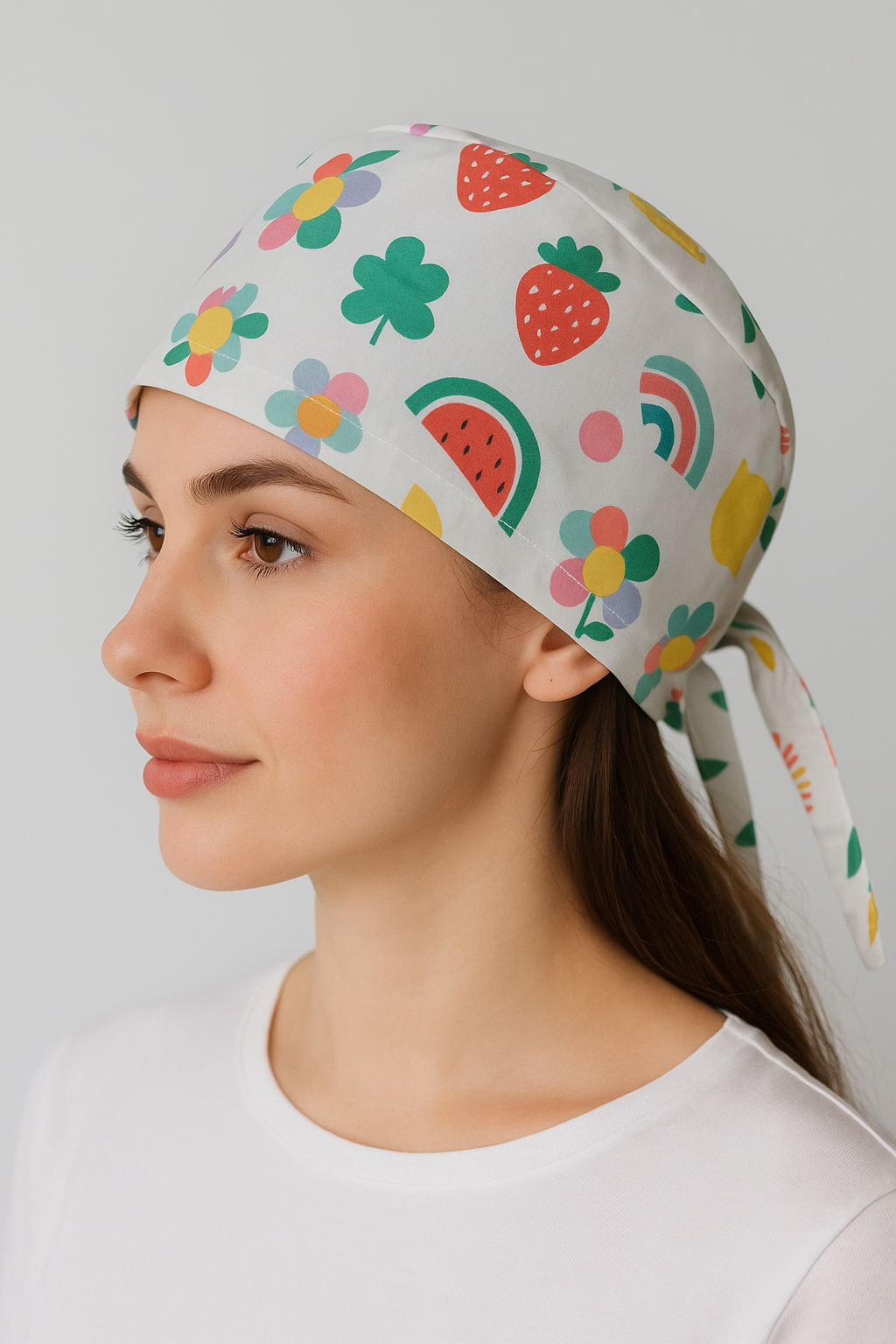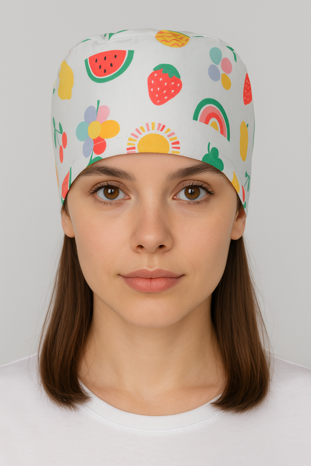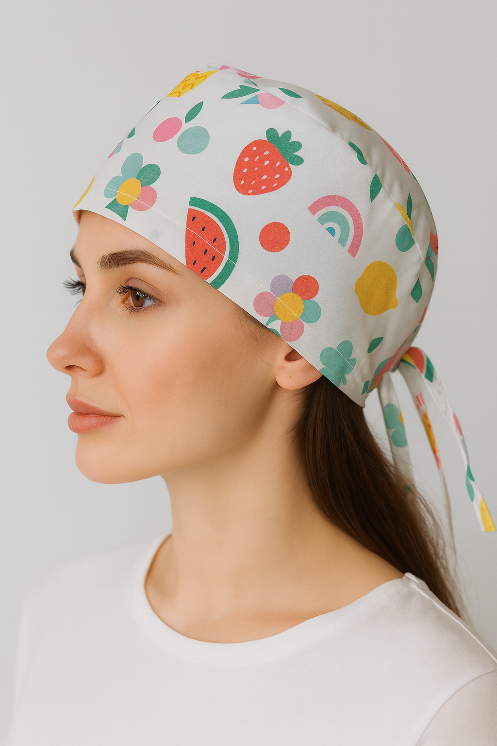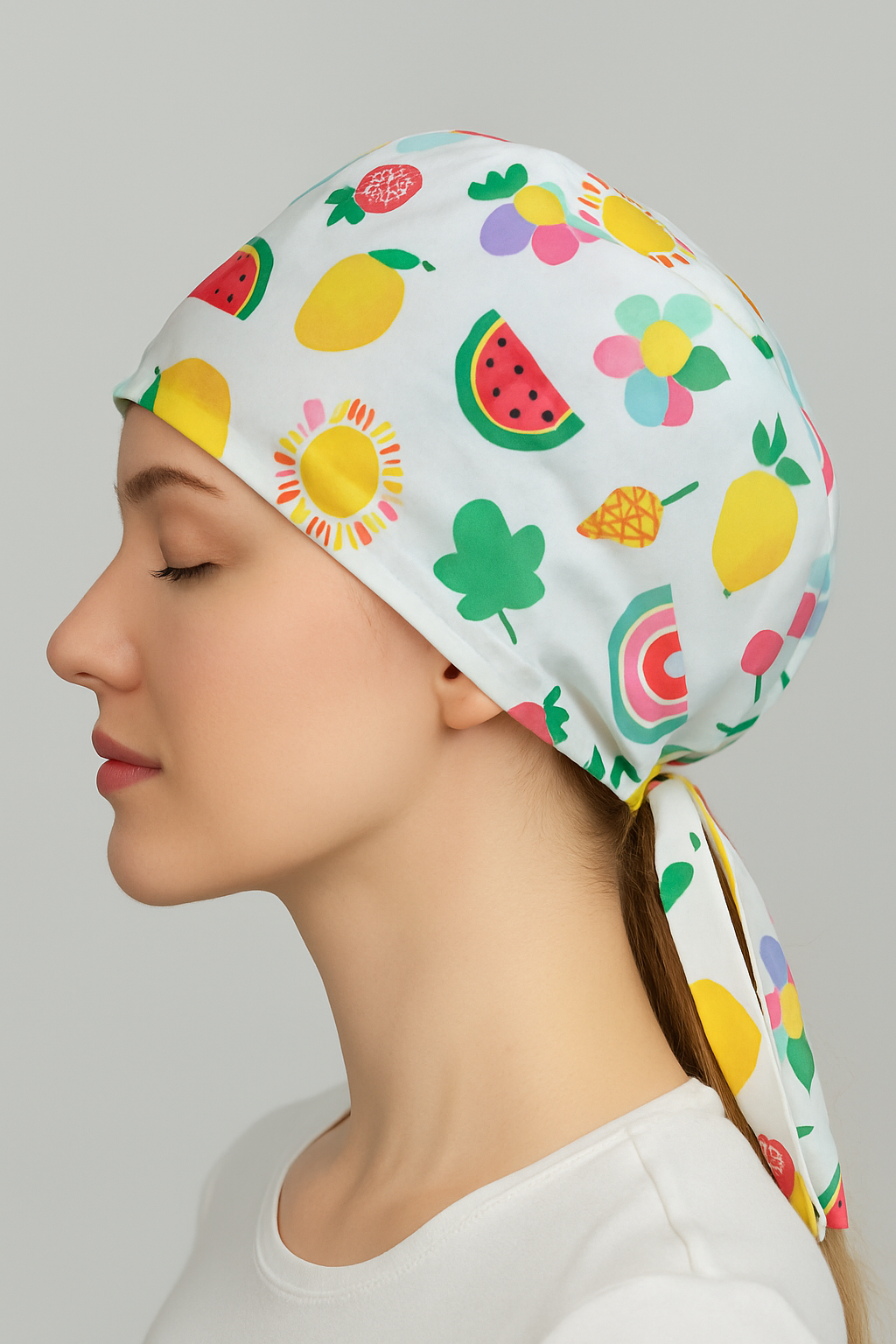 %100 pamuktan üretilen bu meyve desenli cerrahi bone, sağlık çalışanlarının yoğun iş temposuna hem konfor hem de eğlenceli bir dokunuş getiriyor. Doğal kumaşı sayesinde başı terletmez, nefes alabilir yapısıyla gün boyu rahatlık sunar. Arka kısmındaki ayarlanabilir bağcıklı tasarımı, farklı baş ölçülerine kolayca uyum sağlar. Canlı meyve ve gökkuşağı desenleriyle çalışma ortamına pozitif enerji katar.