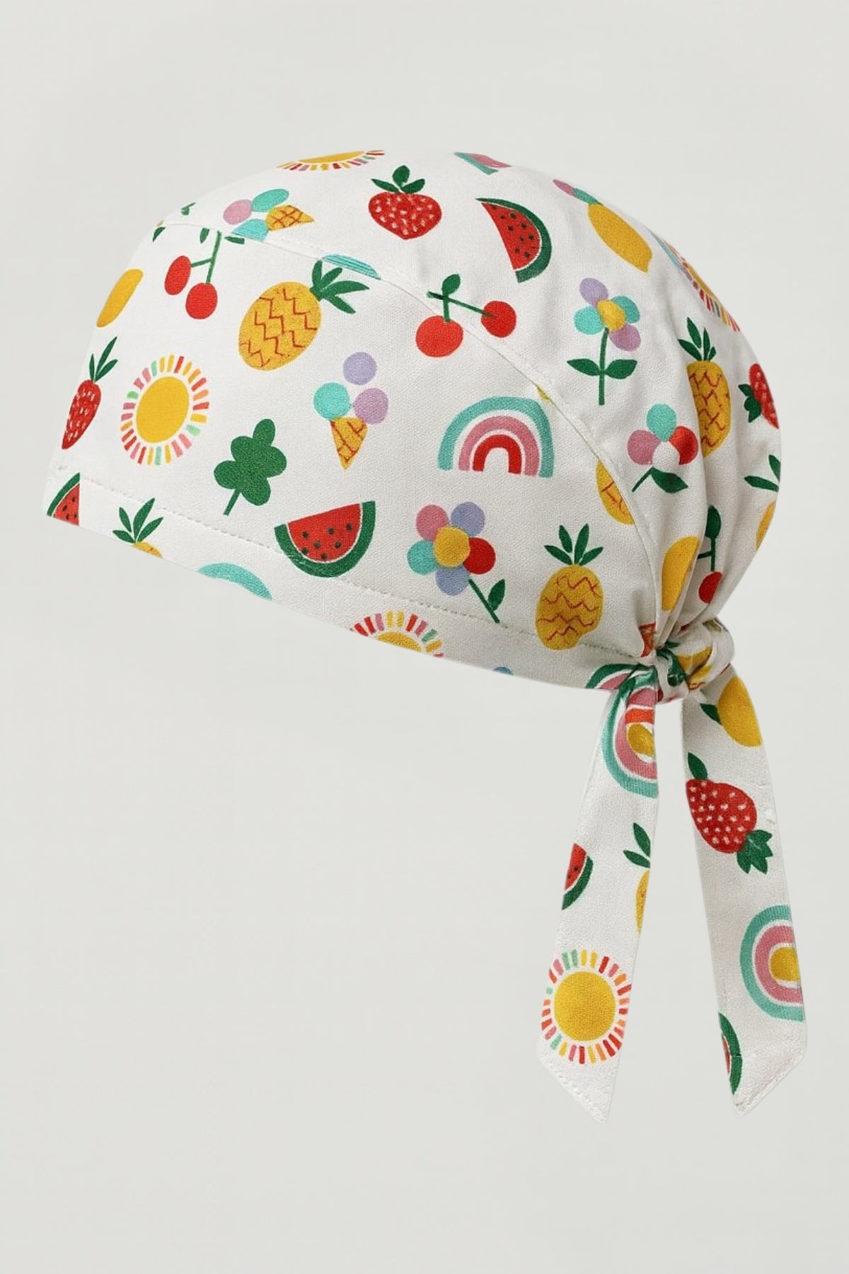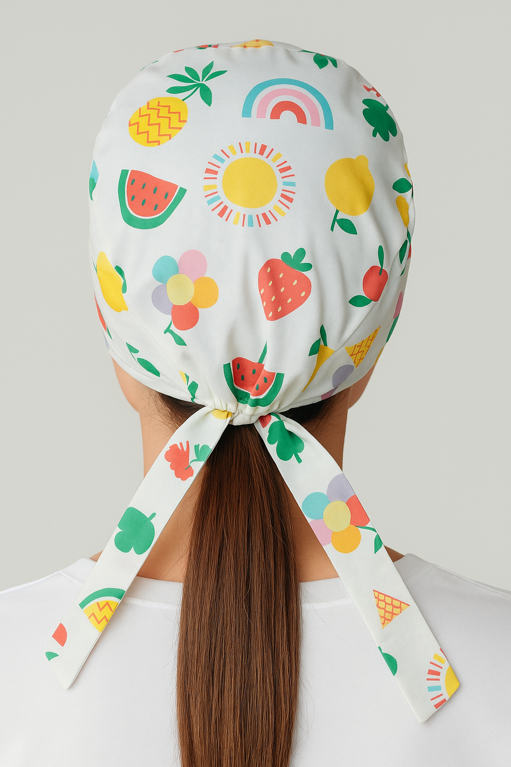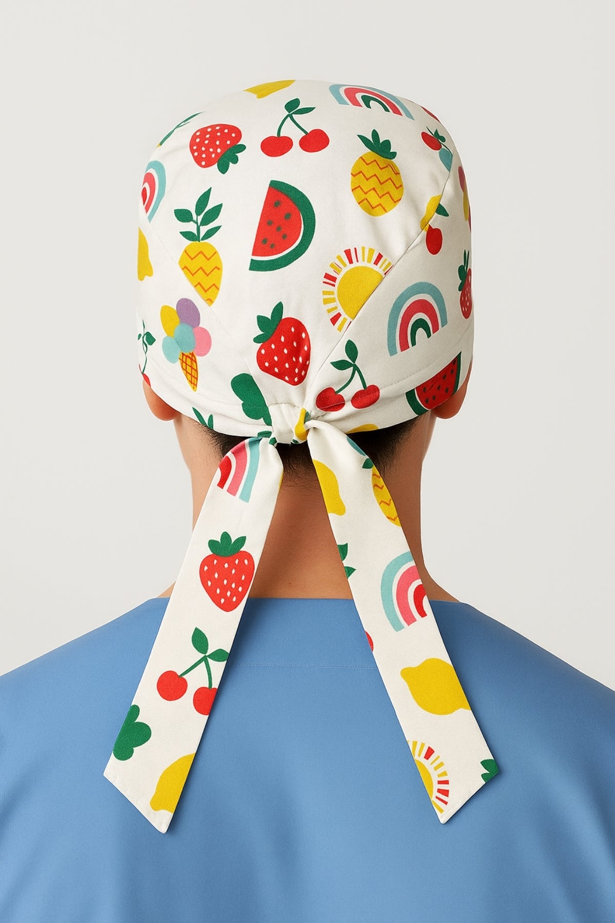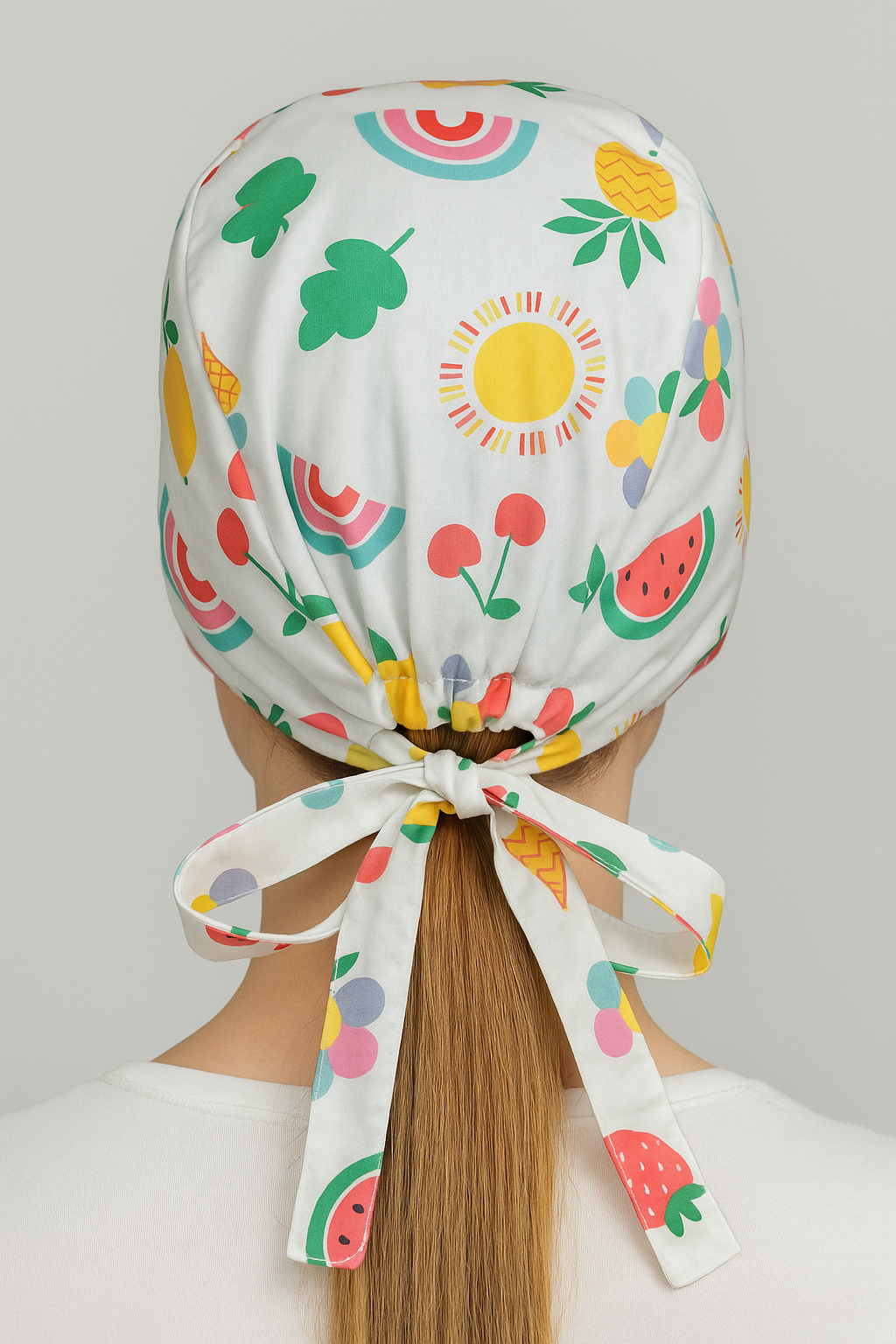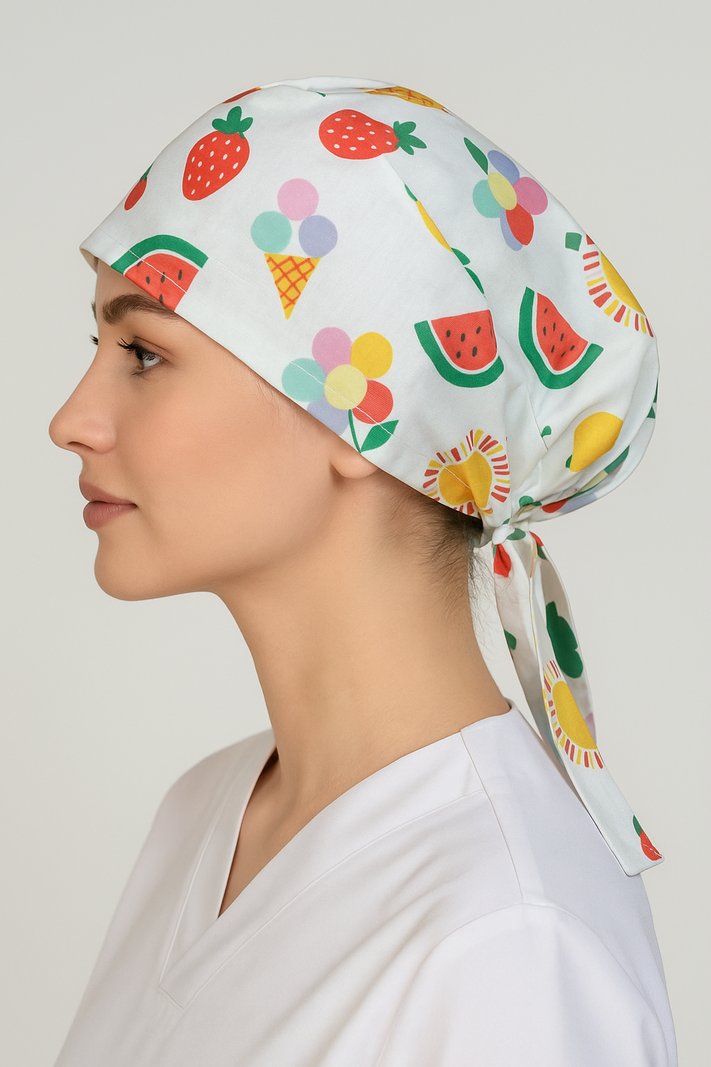 %100 pamuktan üretilen bu meyve desenli cerrahi bone, sağlık çalışanlarının yoğun iş temposuna hem konfor hem de eğlenceli bir dokunuş getiriyor. Doğal kumaşı sayesinde başı terletmez, nefes alabilir yapısıyla gün boyu rahatlık sunar. Arka kısmındaki ayarlanabilir bağcıklı tasarımı, farklı baş ölçülerine kolayca uyum sağlar. Canlı meyve ve gökkuşağı desenleriyle çalışma ortamına pozitif enerji katar.