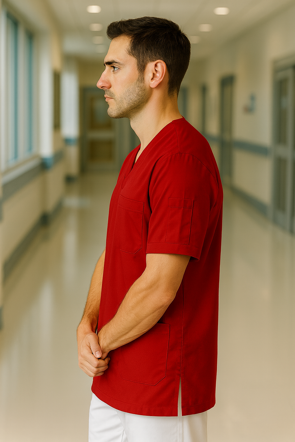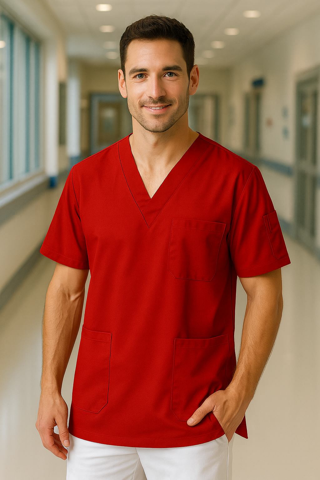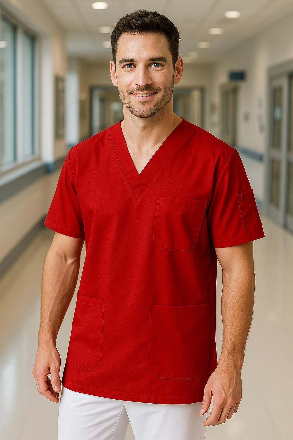 Kırmızı tek üst scrubs forma, sağlık çalışanlarının uzun saatler boyunca ihtiyaç duyduğu konforu ve dayanıklılığı bir arada sunar. %67 PES ve %33 pamuk karışımı özel kumaşı sayesinde terletme ve solma yapmaz, gün boyu nefes alabilen yapısı ile ferahlık sağlar. Unisex kalıpta üretilmiştir; hem kadın hem erkek sağlık çalışanları için uygundur. Kolay ütülenebilir yapısı ile çok buruşma yapmaz, pratik cepleri ile işlevsellik sunar. Klinikler, hastaneler ve laboratuvarlar için profesyonel bir seçimdir.