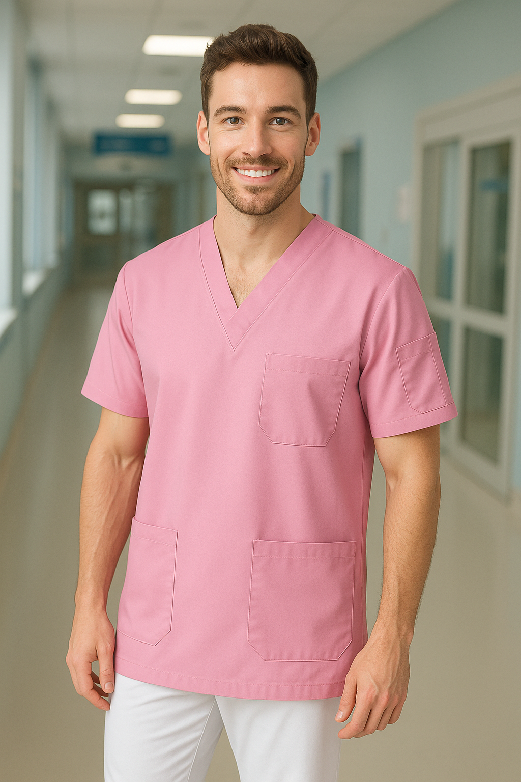 Tek Üst 4 Cepli Erkek Scrubs Forma - Şeker Pembe