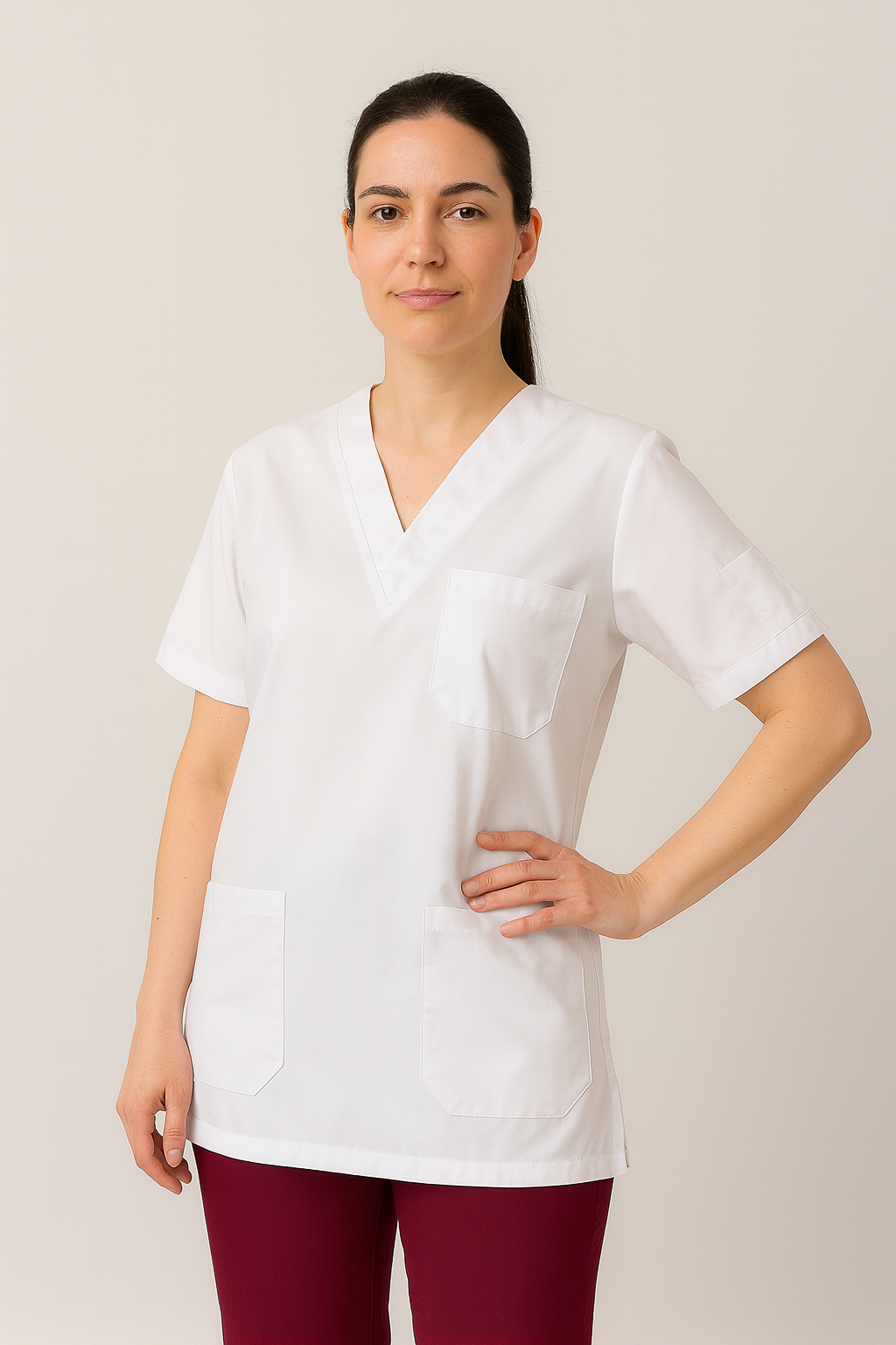 Beyaz tek üst scrubs forma, sağlık çalışanlarının uzun saatler boyunca ihtiyaç duyduğu konforu ve dayanıklılığı bir arada sunar. %67 PES ve %33 pamuk karışımı özel kumaşı sayesinde terletme ve solma yapmaz, gün boyu nefes alabilen yapısı ile ferahlık sağlar. Unisex kalıpta üretilmiştir; hem kadın hem erkek sağlık çalışanları için uygundur. Kolay ütülenebilir yapısı ile çok buruşma yapmaz, pratik cepleri ile işlevsellik sunar. Klinikler, hastaneler ve laboratuvarlar için profesyonel bir seçimdir.